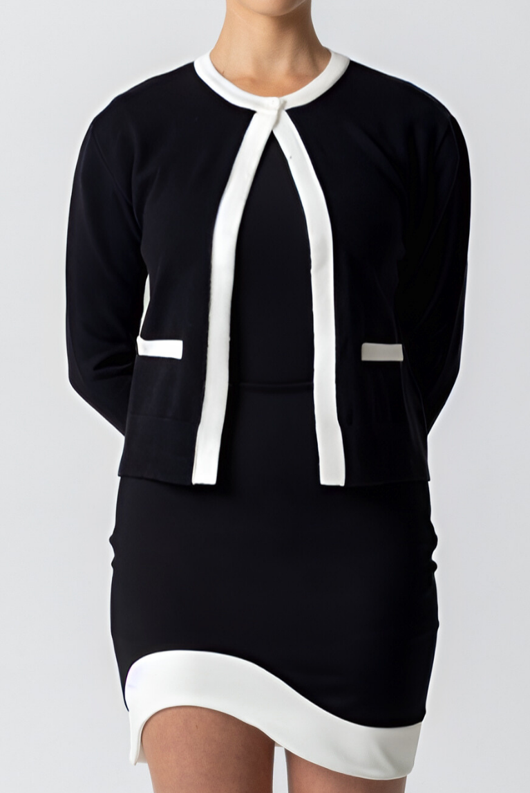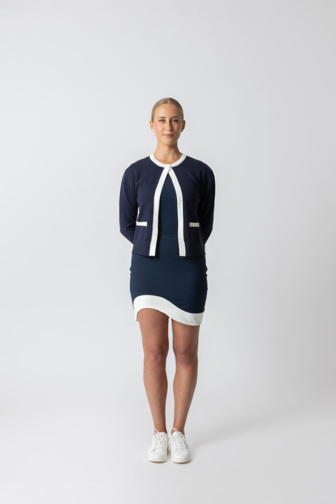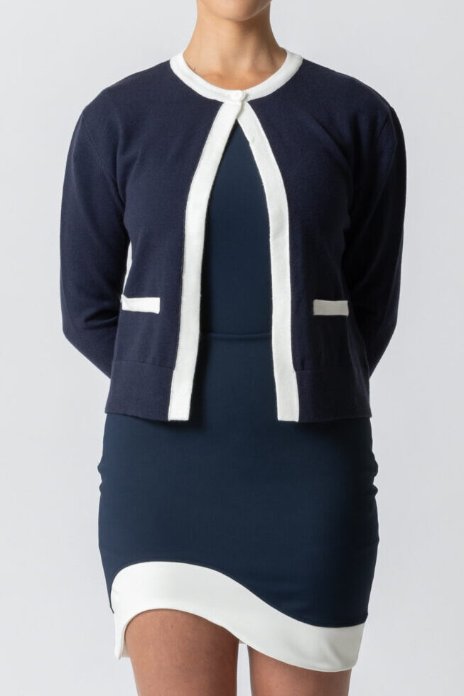 • Classic round neck with button closure • Contrasting white trim along the neckline and front opening • Soft to the touch • Easy to care for